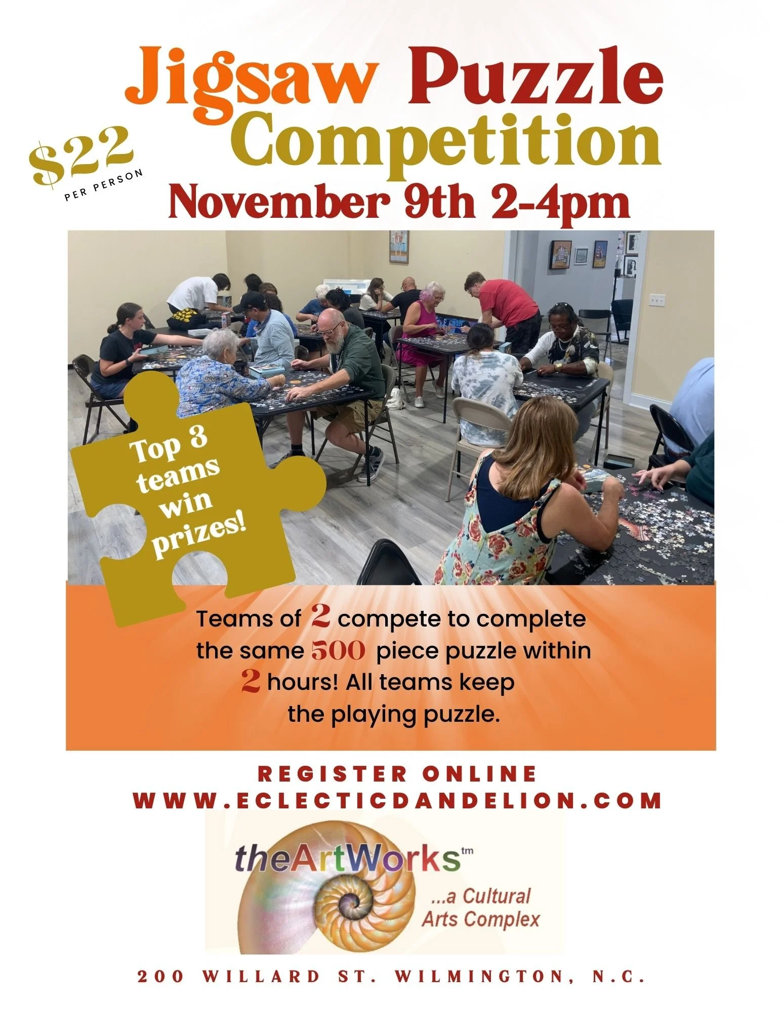 2nd Sunday November 9th @ theArtWorksa Jigsaw Puzzle competition! 2:00.PM. Players register on Erika Tully's website at www.eclecticdandelion.com. The cost is $22 per person to play. Prizes are awarded to the first 3 finishing teams and they keep the puzzle that they play with.